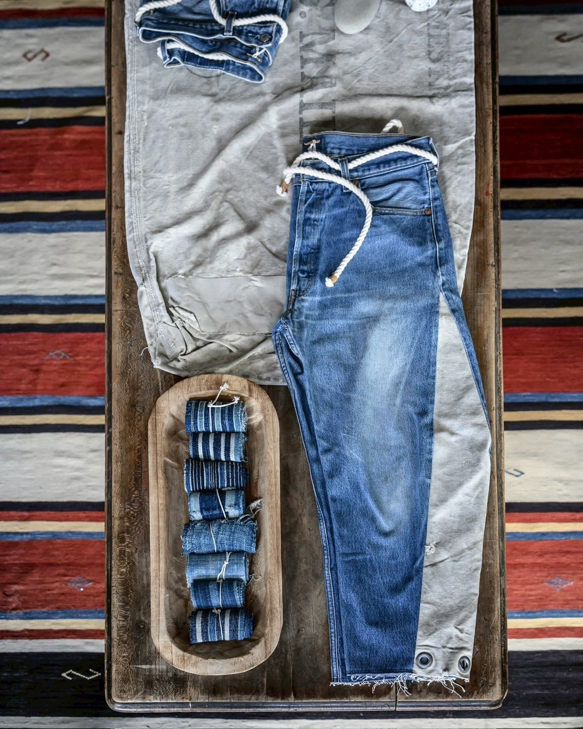 ヴィンテージのインディゴ生地を使い様々な