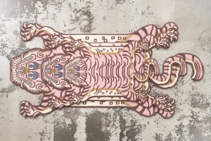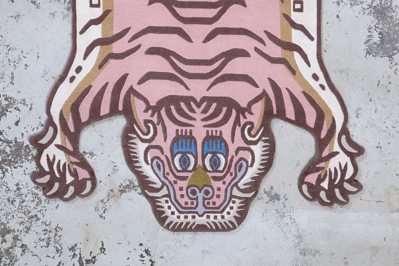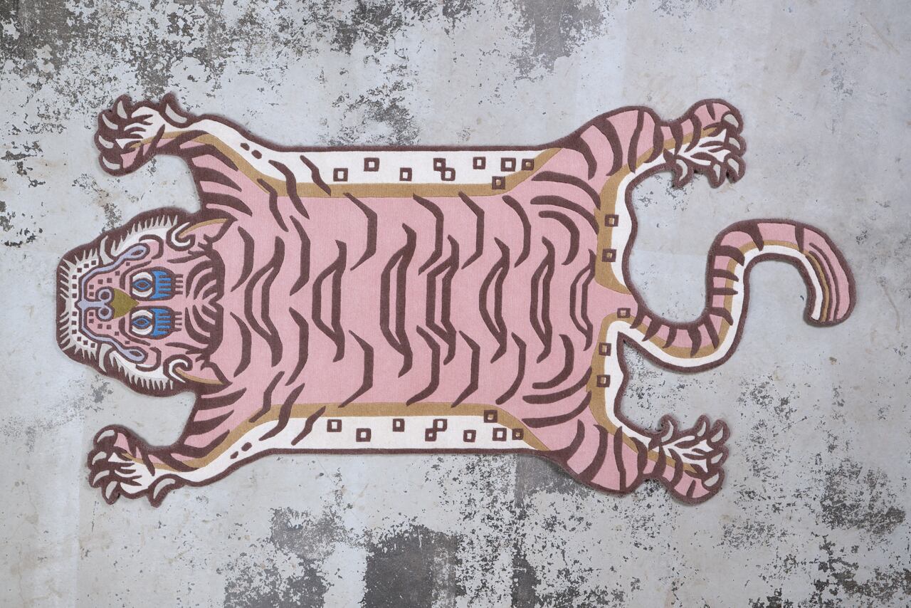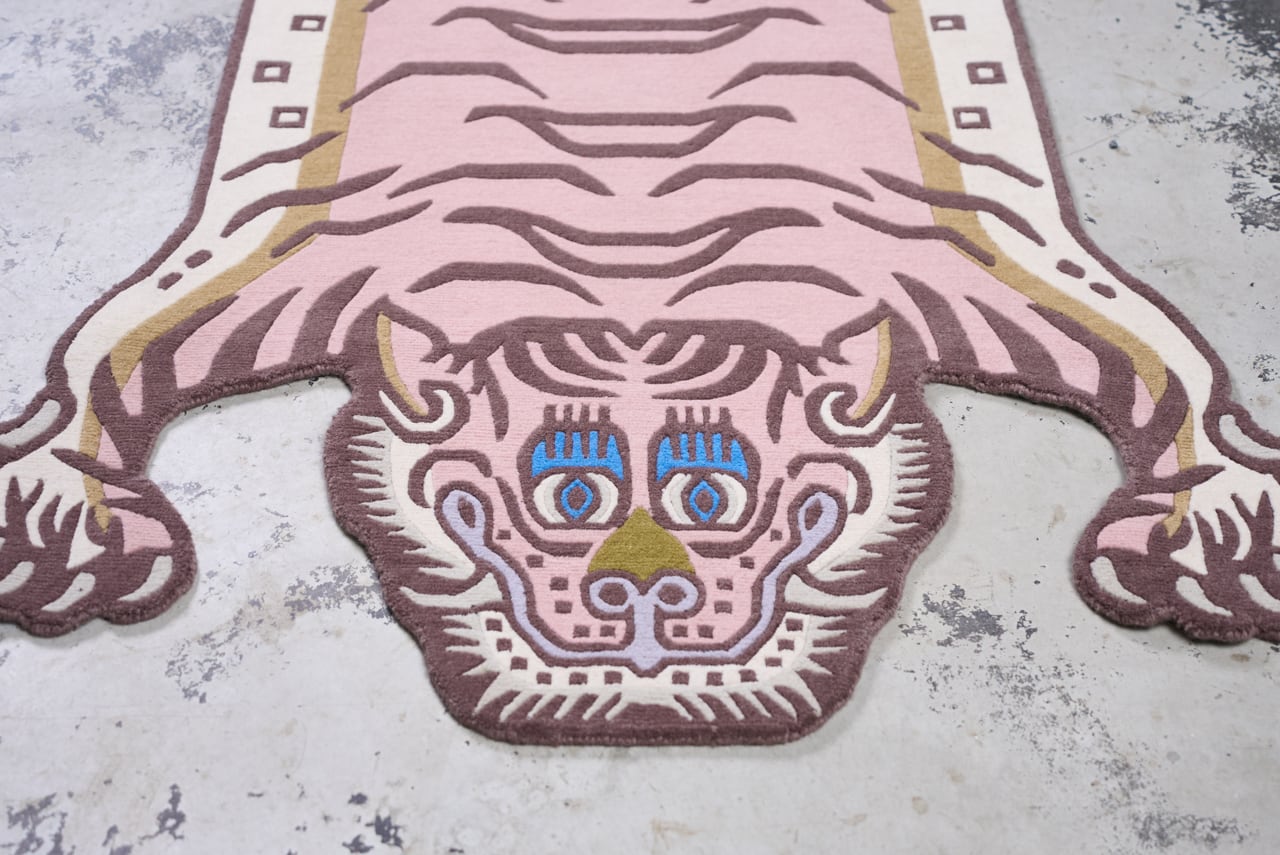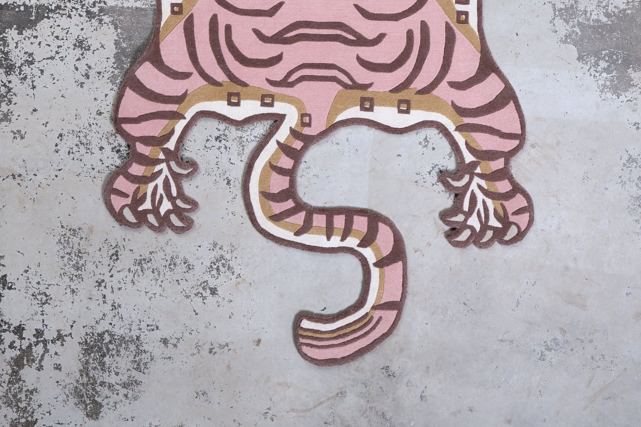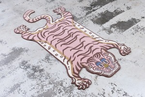 パステルなピンクをメインに据えたラグは、同じ虎の表情でも印象をガラッと変えます。